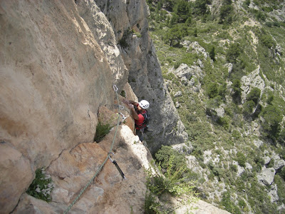 El comienzo mucho menos roto de lo que recordaba, el puente de roca anterior al clavo que para mí era pa matarse tiene el ancho de mi muñeca y encima se puede reforzar. Y en el bloqueo largo que la otra vez no llegaba, esta vez a la primera y no a la cinta sino al clavo, que me he fijado a conciencia.. lo que es tener la cuerda por arriba jeje